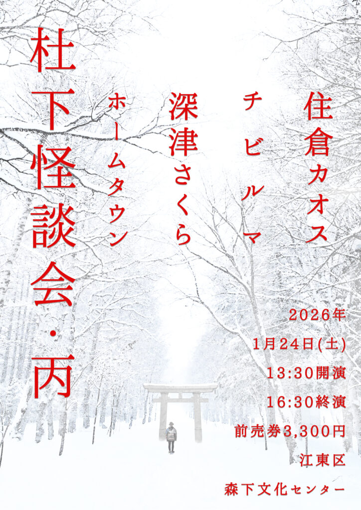 杜下怪談会 第十二乃怪 2026年01月 チビルマ ホームタウン 住倉カオス 深津さくら Post Share Hatena 2026/1/24(土)開催時間:13:30~16:30 (開場時間13:15~)会場:森下文化センター(和室)出演:住倉カオス、チビルマ、深津さくら、ホームタウン DJ UNIT 銀座線のホームタウンがオーガナイズする不定期レギュラー怪談イベント。怪談作家、怪談師、怪談好きな方々をMIXして、怪談初心者から怪談ジャンキーまで“怖いを楽しめる怪談会”をお贈り致します。ホームタウンでホームタウンによるホームタウンの怪談会……それが『杜下怪談会』です。 チケットはこちら! 『杜下怪談会 第十二乃怪』2026/01/24(土)13:30~16:30 (開場13:15~)森下文化センター(東京都江東区)■出演住倉カオス@Kaoss チビルマ@chibiru_m 深津さくら@f_sa13 ホームタウン#怪談イベント#杜下怪談会https://t.co/0PAYryfn99— 里町昌志 aka ホームタウン (DJ UNIT銀座線 / 怪談収集家 / 怪談ガタリー編集長) (@kdn_hometown) November 16, 2025 Post Share Hatena この記事のタイトルとURLをコピーする 恐点 ~怪談大忌利~ 2026 如月の陣 前の記事 裏怪 次の記事